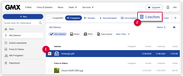Gelöschte Dateien oder Ordner werden zunächst in den Papierkorb verschoben. Um sie