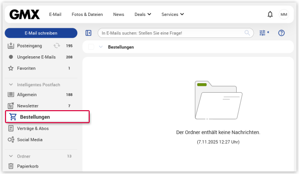 Wenn Sie alle E-Mails der Kategorie Bestellungen sehen möchten, können Sie