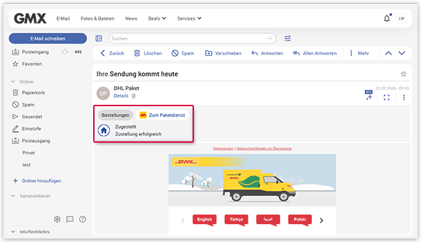 Wenn Sie die Paketverfolgung aktiviert haben, können Sie in Ihrem GMX Postfach detaillierte Informationen zu Ihren Bestellungen