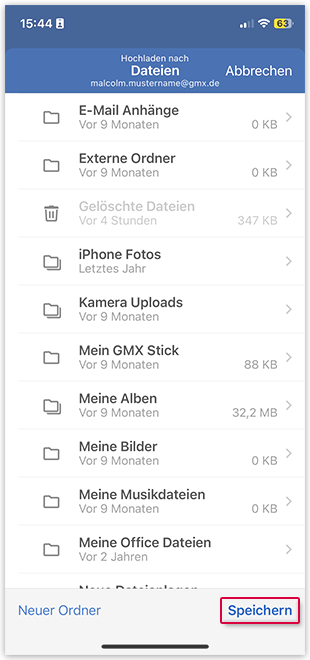 Sie können einen Anhang einer E-Mail in der GMX Mail App für iOS entweder in